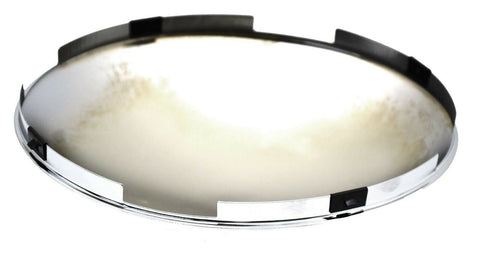 THIS CHROME PLATED METAL HUB CAP HAS 4 EVEN NOTCHES, WITH AN 7/16 INCH LIP. IT IS DESIGNED FOR STEEL WHEELS. IT WILL FIT 20, 22.5, AND 24.5 INCH WHEELS WITH AN 8-23/32 CENTER HOLE. (will not work on Alcoa wheels). THIS IS THE DOME STYLE, WITH 4 CLIPS. NEW. SOLD AS A PAIR.