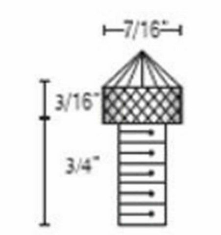 - Size: threaded shaft 3/4" long, 3/16" diameter; head diameter 7/16"; 3/16" tall knurled edge; overall length including jewel tip 1 1/16"