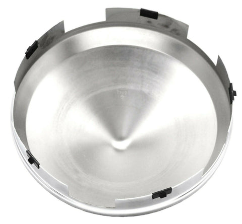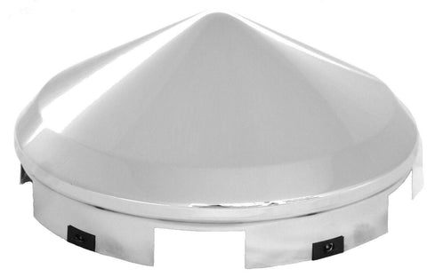 | THIS CHROME PLATED METAL HUB CAP HAS 5 EVEN 1 INCH NOTCHES. IT IS DESIGNED FOR ALUMINUM WHEELS. IT WILL FIT 20, 22.5 , AND 24.5 INCH WHEELS WITH AN 8-23/32 CENTER HOLE (will not work on Alcoa wheels). THIS IS THE CONE OR POINTED STYLE, WITH CLIPS. NEW, BULK PACKAGING. EACH. |