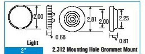 THIS IS A 2 INCH BLUE LENS SINGLE BULB 12 VOLT SEALED LIGHT. THE SINGLE BULB IS NOT REPLACEABLE. IT IS 5/8 OF AND INCH DEEP AND 2 INCHES IN DIAMETER. IT REQUIRES A 2-1/4 INCH HOLE AND A RUBBER GROMMET TO HOLD THE LIGHT IN. IT USES A TWO PRONG PIGTAIL, WHICH IS NOT INCLUDED. NEW, BULK PACKAGING. Set of 2.