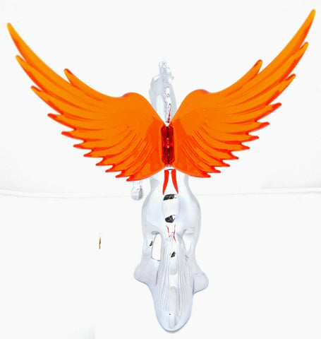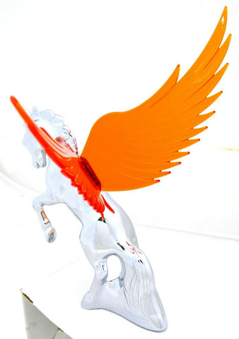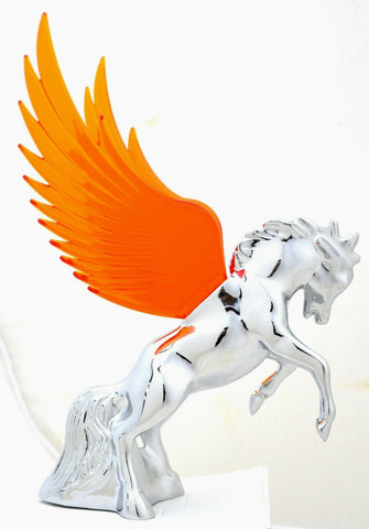 | This chrome die cast body fighting stallion has colored plastic wings. It has a single bayonet incandescent bulb (12 volt, 3 watt) to light up the wings with a gentle glow effect. It will fit a flat surfaced hood. It may require drilling holes in the hood of the vehicle since it needs one for the wire and 2 holes for the studs (one of the studs holds the light bulb base in place). Each. - Material: chrome die cast body, plastic wings