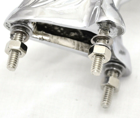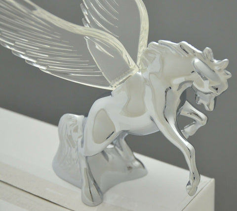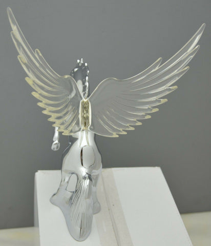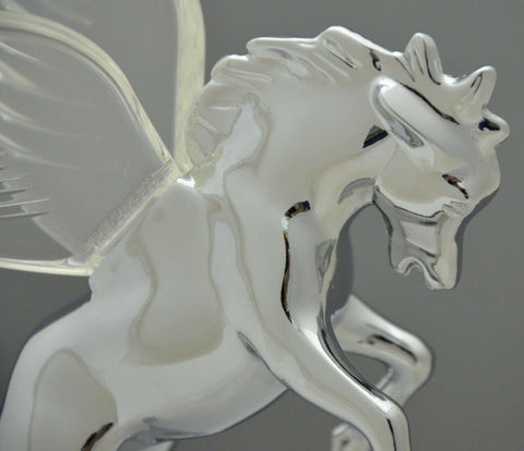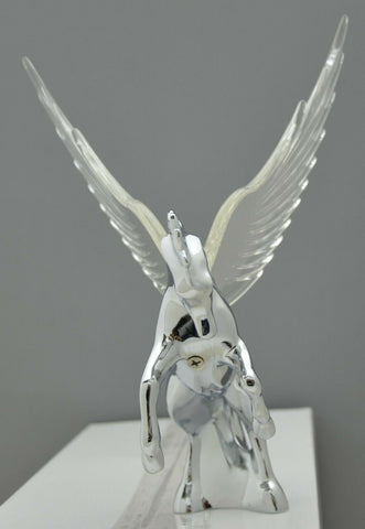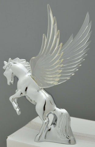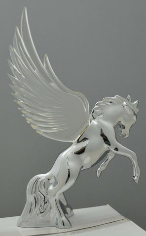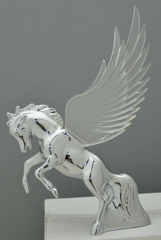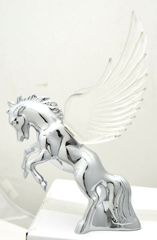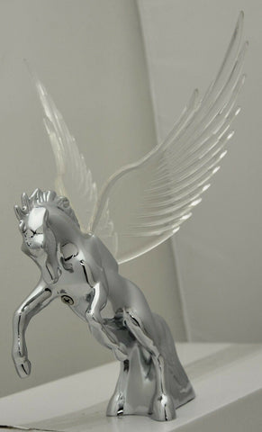 | This chrome die cast body fighting stallion has colored plastic wings. It has a single bayonet incandescent bulb (12 volt, 3 watt) to light up the wings with a gentle glow effect. It will fit a flat surfaced hood. It may require drilling holes in the hood of the vehicle since it needs one for the wire and 3 holes for the studs (one of the studs holds the light bulb base in place). Each. - Material: chrome die cast body, plastic wings