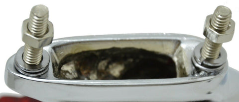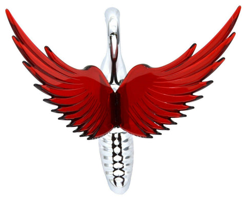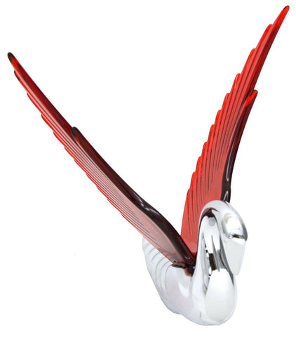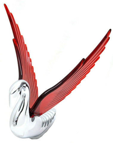 This chrome die cast body swan has colored plastic wings. It has a single bayonet incandescent bulb (12 volt, 3 watt) to light up the wings with a gentle glow effect. It will fit a flat surfaced hood. The base is 3" by 7/8" and the mounting stud holes are 2 3/8" apart measuring center to center of the the mounting holes. Each.