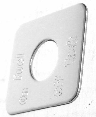 | THIS STAINLESS STEEL PLATE GOES BEHIND THE TOGGLE SWITCH. IT IS 1-1/8 BY 1-1/4 INCHES, WITH AND A 7/16 INCH DIAMETER OPENING. THE LETTERING IS BLOCKED. THE SWITCH FACE NUT HOLDS IT ON. IT FITS FREIGHTLINER TRUCKS. NEW. EACH. |