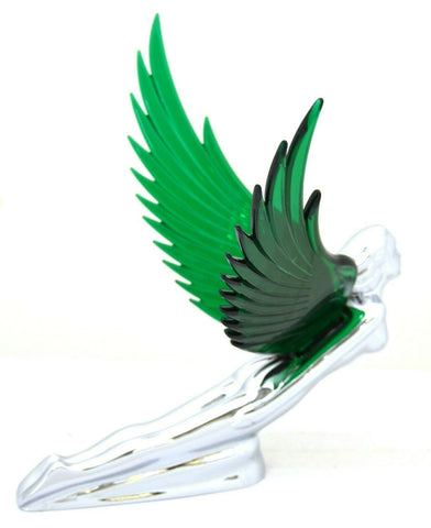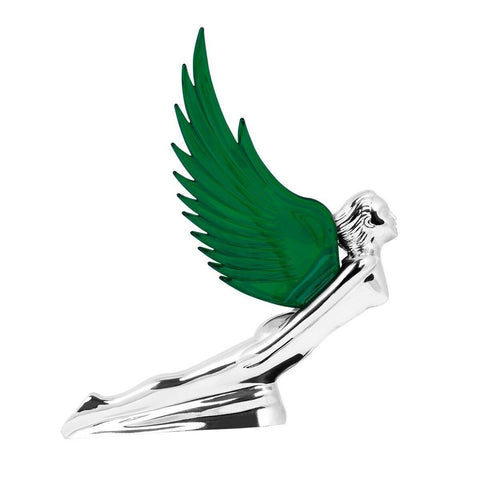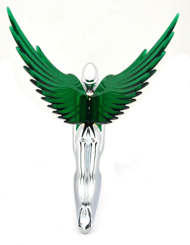This chrome die cast body flying goddess has colored ABS wings. It has a single bayonet incandescent bulb (12 volt, 3 watt) to light up the wings with a gentle glow effect. It will fit a flat surfaced hood. The base is oval in shape and the mounting stud holes are 4 1/4" apart measuring center to center of the the mounting holes. Each.