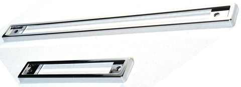 THIS CHROME PLASTIC INSTRUMENT PANEL COVER SET FITS PETERBILT 370 SERIES TRUCKS. IT GOES AROUND THE DASH INSTRUMENT WARNING LIGHTS. THE LONGEST ONE IS 12.5 INCHES LONG AND 1 INCH WIDE THE SHORT ONE IS 5-5/8 INCHES LONG AND 1 INCH WIDE. IT FITS PETERBILT 370 SERIES 1987-1991. NEW. SET.