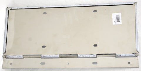 | THIS IS A PIANO HINGED STAINLESS STEEL HOLDER, WITH HOLES TO MOUNT A SINGLE LICENSE PLATE. IT HAS ROLLED EDGES ON 3 SIDES. IT IS 18 1/4 INCHES LONG AND 7 1/4" TALL NOT INCLUDING THE 1 7/8" WIDE HINGE MOUNT. THE OUTER TWO ROUND HOLES ARE 15 13/16 APART MEASURING IN THE CENTER OF THE HOLES. THE FIRST HOLE IS 1 3/16" IN FROM THE LEFT EDGE, THE SECOND HOLE IS 9 1/16" FROM THE LEFT EDGE AND THE 3RD ROUND HOLE IS 17" FROM THE LEFT EDGE. THE ADJUSTABLE HOLES ARE 5 5/8" FROM THE LEFT EDGE AND THE 2ND ADJUSTABLE HOLE IS 12 9/16" FROM THE LEFT EDGE. THE ADJUSTABLE HOLES ARE 11" APART MEASURING IN THE CENTER OF THE HOLE TO THE CENTER OF THE HOLE. THE WHITE PROTECTIVE PLASTIC FILM NEEDS TO BE REMOVED AFTER INSTALLATION. NEW, BULK PACKAGING. EACH. |