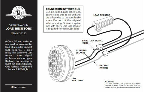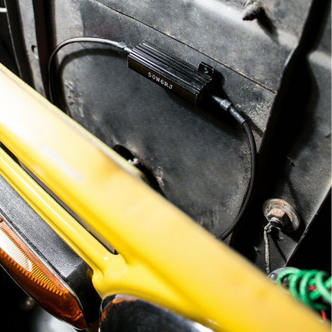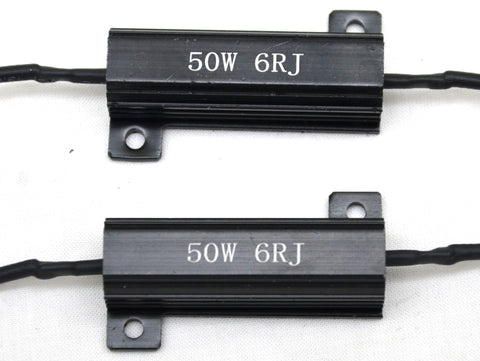 This load resistor set simulates the electrical load of an incandescent bulb. It can be used to to help with hyper flashing turn signals, no flashing signals, or a burnt out bulb indicator light when using LED lights & bulbs or LED headlights. This is a set of 2 resistors with 4 connectors. They have a tough aluminum housing with Proprietary Heat Management and are 50 watt-6 OHM. Installation guide is enclosed in the box. New. set of 2.
