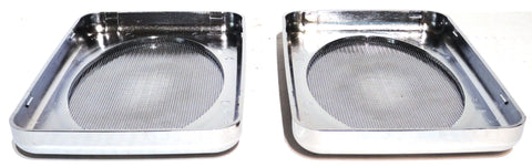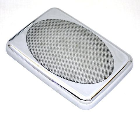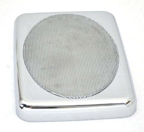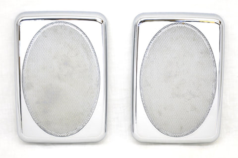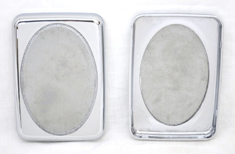 This set of two speaker covers fit Peterbilt 379 and Platinum series trucks. They go above the door and they are 7 inches long and 4-7/8 inches wide and 3/4 of an inch thick. They are made of chrome plastic and have a chrome metal screen. They are a snap on application. New. Set of two. Bulk packaging.