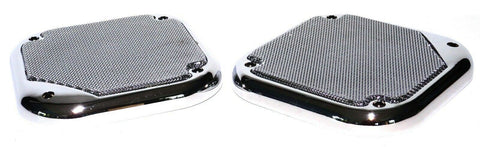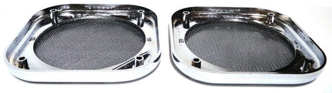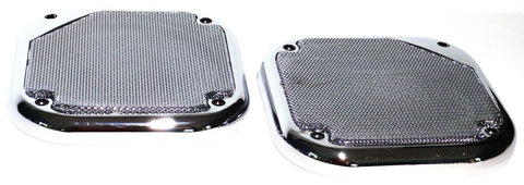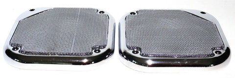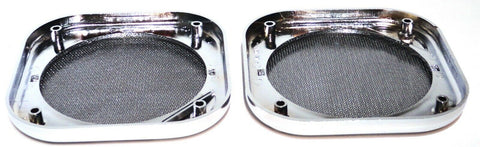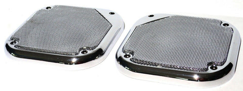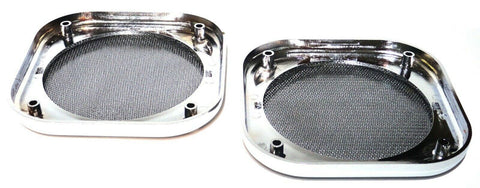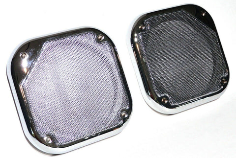 | THIS IS A TWO PIECE SET. THE SPEAKER COVERS ARE CHROME PLASTIC WITH A CHROME METAL SCREEN. THEY ARE 5-1/2 INCHES IN DIAMETER. THEY HAVE FOUR SCREW HOLES. THEY FIT THE SPEAKERS IN KENWORTH AND FREIGHTLINER TRUCKS. NO HARDWARE. NEW. PAIR. |
