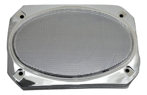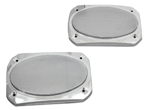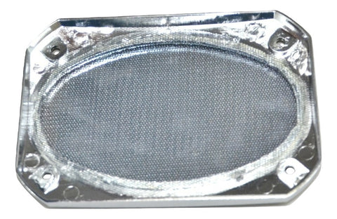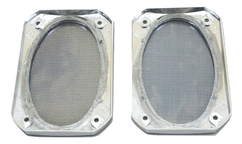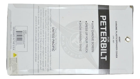 | THIS IS A SET OF TWO PETERBILT CHROME PLASTIC SPEAKER COVERS. THEY HAVE AN CHROME METAL SCREEN IN THE CENTER AND 4 SCREW HOLES. THEY ARE 7 INCHES BY 4-7/8 INCHES. SCREWS NOT INCLUDED. NEW. SET OF TWO. |
