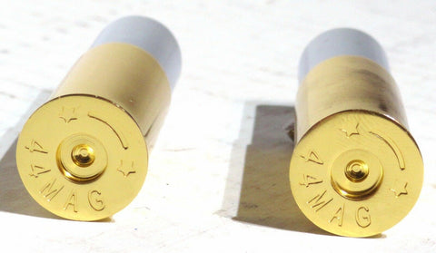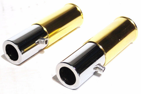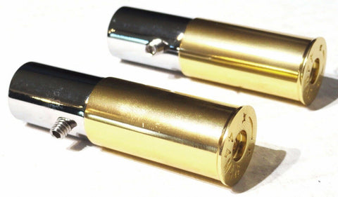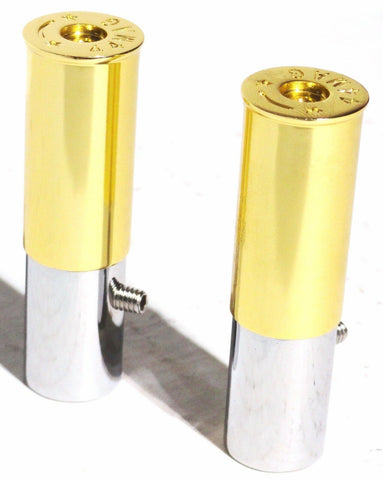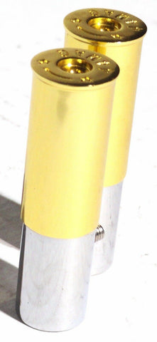 THIS IS A PAIR OF ALUMINUM BULLET CASING TOGGLE SWITCH EXTENSIONS. THE END HAS 44 MAG AND IT IS BRASS COLORED. THEY ARE 2-1/8 INCHES LONG, THE GOLD PART IS 1 5/16" AND THE SILVER BASE IS 7/8". THE BASE OPENING IS 3/8" DIAMETER AND HAS AN OUTSIDE DIAMETER OF 9/16". THEY MOUNT WITH A SET SCREW. THEY FIT THE ROUND TOGGLE SWITCHES. NEW. PACKAGE OF TWO. |