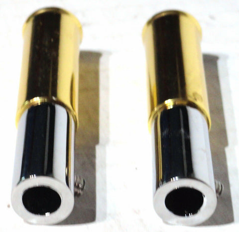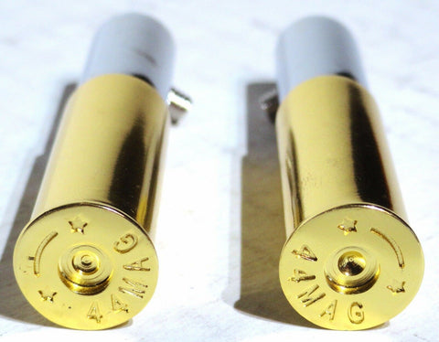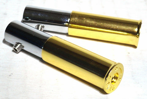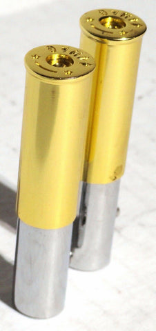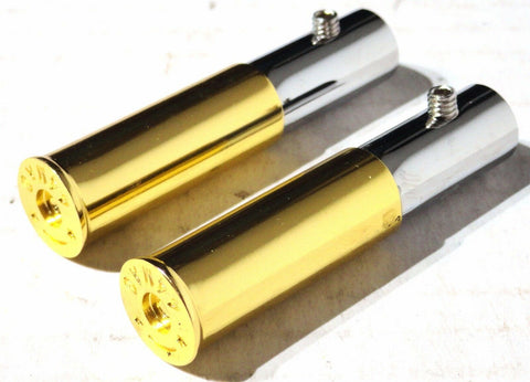 |   THIS IS A PAIR OF ALUMINUM BULLET CASING TOGGLE SWITCH EXTENSIONS. THE END HAS 44 MAG AND IT IS BRASS COLORED. THEY ARE 2-1/8 INCHES LONG AND MOUNT WITH A SET SCREW. THE TOP HAS A 1/2" DIAMETER, THE BASE IS 7/16" IN DIAMETER, THE BASE INSIDE DIAMETER IS 1/4" AND THE SET SCREW IS 3/8" FROM THE BOTTOM. NEW. PACKAGE OF TWO.  |