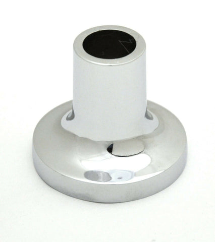 This knob is chrome aluminum and it mounts by screwing on. It has a 1 7/8" diameter top and the base has an 7/8" outside diameter. It comes with 4 glossy plastic stickers-black, blue, red and silver. The sticker is 1-3/4 inches wide and fits the top of the knob. New. Set- 4 stickers and knob.