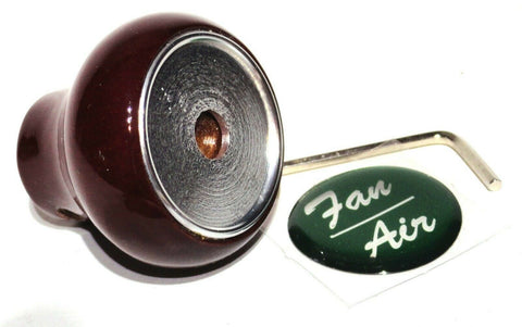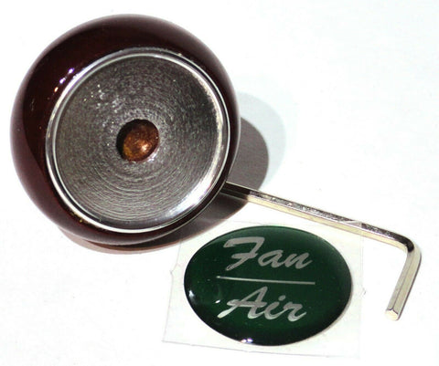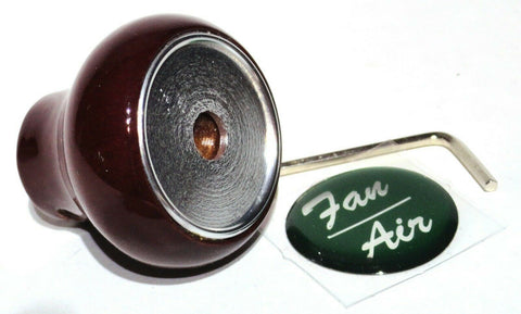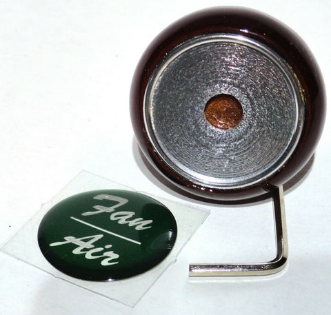 THIS SET CONSISTS OF THE WOOD KNOB AND A GLOSSY PLASTIC STICKER FOR THE TOP OF THE KNOB. THE STICKER IS A 1 INCH DIAMETER WITH THE FAN/AIR IN SILVER LETTERING. THE KNOB IS MOUNTED WITH A SET SCREW AND IT COMES WITH THE ALLEN WRENCH. NEW, BULK PACKAGING. SET.