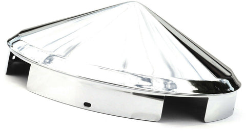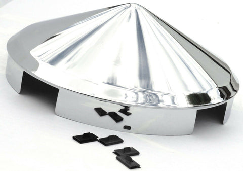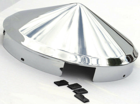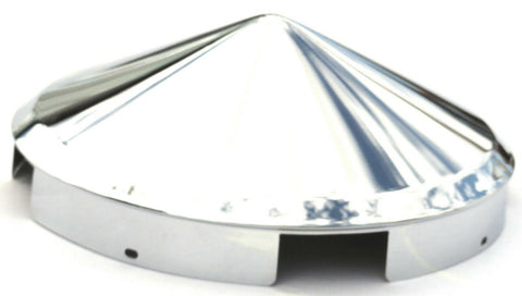 THIS CHROME PLATED METAL HUB CAP HAS 4 EVEN 1 INCH NOTCHES. IT IS DESIGNED FOR ALUMINUM WHEELS. IT WILL FIT 20, 22.5 , AND 24.5 INCH WHEELS WITH AN 8-23/32 CENTER HOLE (will not work on Alcoa wheels). THIS IS THE CONE OR POINTED STYLE, WITH 4 CLIPS. NEW. SOLD AS A PAIR. |