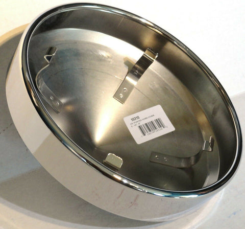 THIS IS A CHROME STEEL HORN COVER. IT HAS 4 TABS ON THE BACK THAT CAN BE ADJUSTED BY BENDING THEM TO FIT. IT WILL FIT A 5-1/2 INCH TO 6 INCH DIAMETER ROUND HORN BELL. IT HAS AN 7 7/8" OUTSIDE DIAMETER. NEW, BULK PACKAGING. EACH.