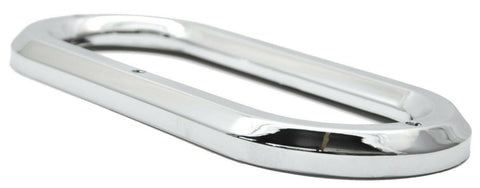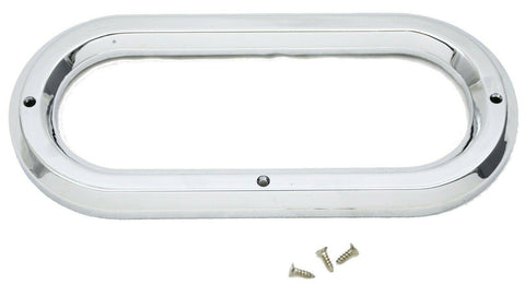 | THIS CHROME PLASTIC BEZEL FITS AN LARGE OVAL LIGHT. IT IS 8" WIDE AND 3 5/8" TALL. IT HAS A 5/8" WIDE RIM. WITH THE SCREW HOLE ON TOP THE LEFT MOUNTING HOLE TO THE TOP MOUNTING HOLE IS 4" ON CENTER. THE TWO CENTER SCREW HOLES ARE 7 1/4" APART ON CENTER. IT IS 1/2" THICK. IT MOUNTS WITH THREE SCREWS TO THE RUBBER GROMMET. NEW, BULK PACKAGING. SET OF 2. |