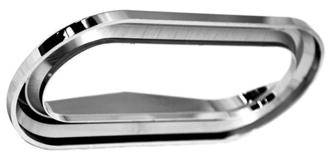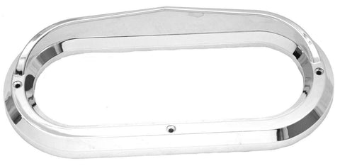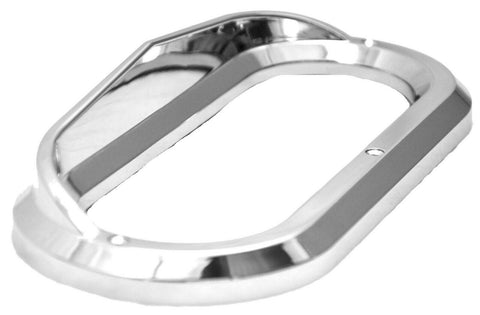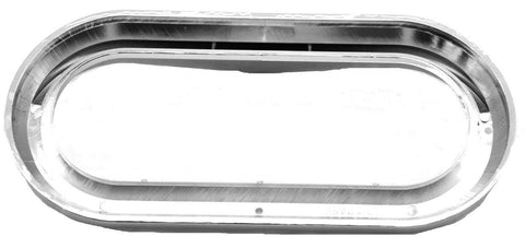 THIS CHROME PLASTIC BEZEL, WITH VISOR, FITS AN OVAL LIGHT. IT HAS AN 6-1/2 INCH WIDE BY 2-1/4 INCH OPENING. IT HAS A 1 1/4" DEEP VISOR AND IT IS 8" WIDE AND 3 5/8" TALL. THE TWO HORIZONTAL SCREW HOLES ARE 7 1/4" ON CENTER AND THE 3RD SCREW HOLE IS 3 7/8" ON CENTER FROM THE LEFT HOLE. IT MOUNTS WITH THREE SCREWS TO THE RUBBER GROMMET. NEW, BULK PACKAGING. EACH.