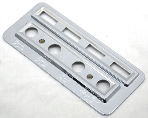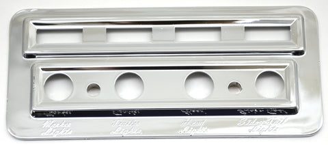 | THIS CHROME PLASTIC PLATE IS 2-3/8 INCHES BY 5.25 INCHES. IT HAS MARKER LIGHTS, TRAILER LIGHTS, HEADLIGHT, AND SIDE & TAIL LIGHT IN ETCHED LETTERING. IT FITS KENWORTH TRUCKS 2002 AND NEWER. IT MOUNTS TO THE RIGHT OF THE TOP CENTER VENT, BETWEEN THE VENT AND THE RADIO. IT COVERS 4 TOGGLE SWITCHES AND THEIR LIGHT INDICATORS. NEW. EACH. |